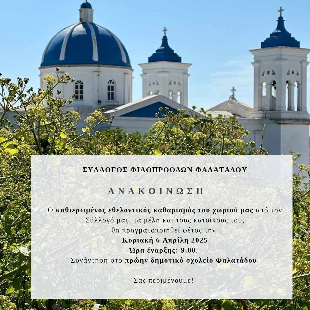 Ο Σύλλογος Φιλοπροόδων Φαλατάδου διοργανώνει και φέτος τον καθιερωμένο εθελοντικό καθαρισμό του χωριού μας, με τη συμμετοχή των μελών και των κατοίκων.