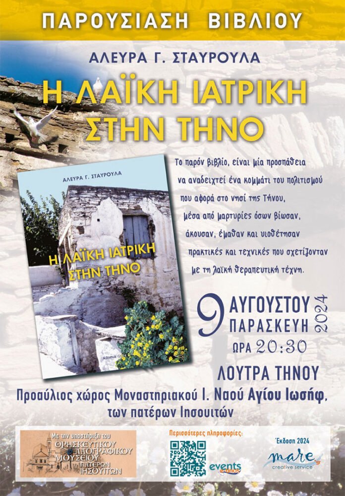 Το παρόν βιβλίο, είναι μία προσπάθεια να αναδειχτεί ένα κομμάτι του πολιτισμού που αφορά στο νησί της Τήνου, μέσα από μαρτυρίες όσων βίωσαν, άκουσαν, έμαθαν και υιοθέτησαν πρακτικές και τεχνικές που σχετίζονταν με τη θεραπευτική τέχνη.