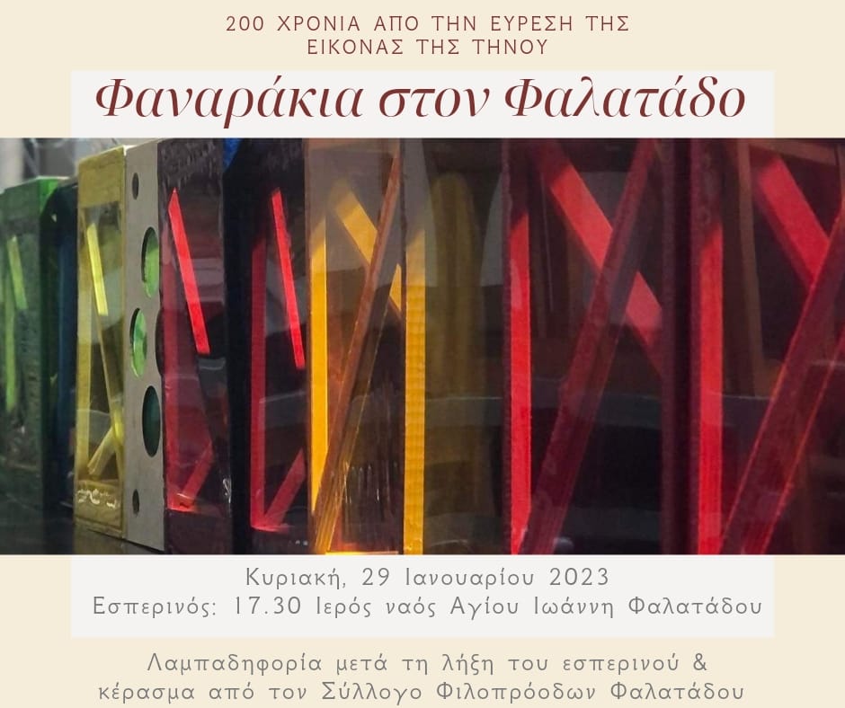 Με χαρά σας προσκαλούμε να γιορτάσουμε την εύρεση της εικόνας της Τήνου, στο χωριό μας, τον Φαλατάδο, τιμώντας την παράδοση και αλλά και τη μνήμη του φαλαταδιανού Δημήτρη Βλάση, η σκαπάνη του οποίου πριν διακόσια χρόνια βρήκε την εικόνα του Ευαγγελισμού του νησιού μας.