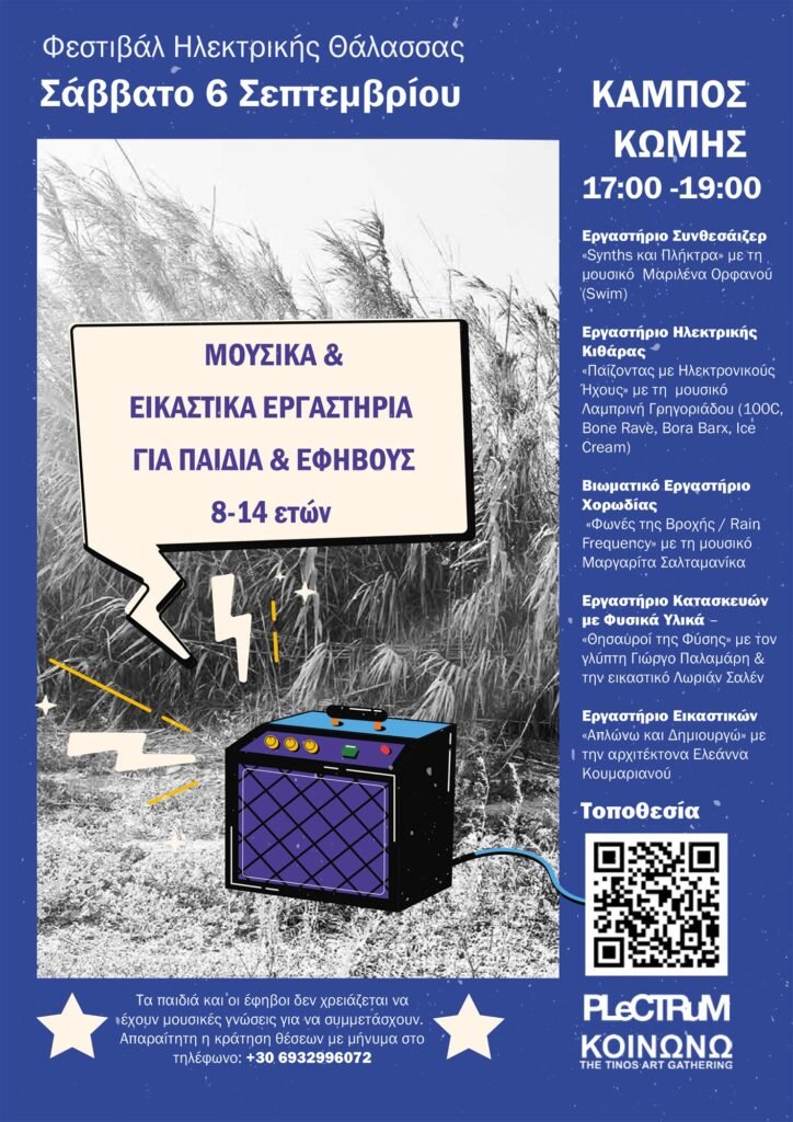 Το Φεστιβάλ Ηλεκτρικής Θάλασσας είναι μια πρωτοβουλία της Plectrum AMKE σε συνεργασία με το Κοινωνώ και θα πραγματοποιηθεί το Σάββατο 6 Σεπτεμβρίου 2025 στον μαγευτικό κάμπο της Κώμης, υπό το φως της Πανσελήνου του Καλαμποκιού.