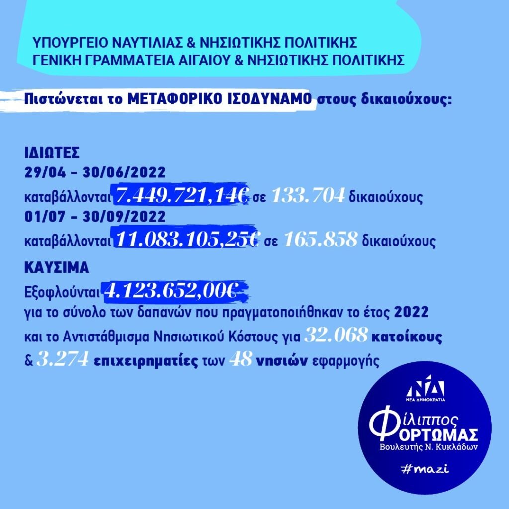 Ο βουλευτής Κυκλάδων της Νέας Δημοκρατίας, κ. Φίλιππος Φόρτωμας, εκφράζει την ικανοποίηση του γιατην έγκριση των πιστώσεων του Μεταφορικού Ισοδυνάμου από το Υπουργείο Ανάπτυξης και Υποδομών προς το Υπουργείο Ναυτιλίας και Νησιωτικής Πολιτικής, καθώς προωθείται από τις 24/4/2023 η πληρωμή του στους δικαιούχους επιβάτες, για καύσιμα και επιχειρήσεις, συνολικού ύψους 40.000.000,00 ευρώ, για το διάστημα έως και 30/09/2022.