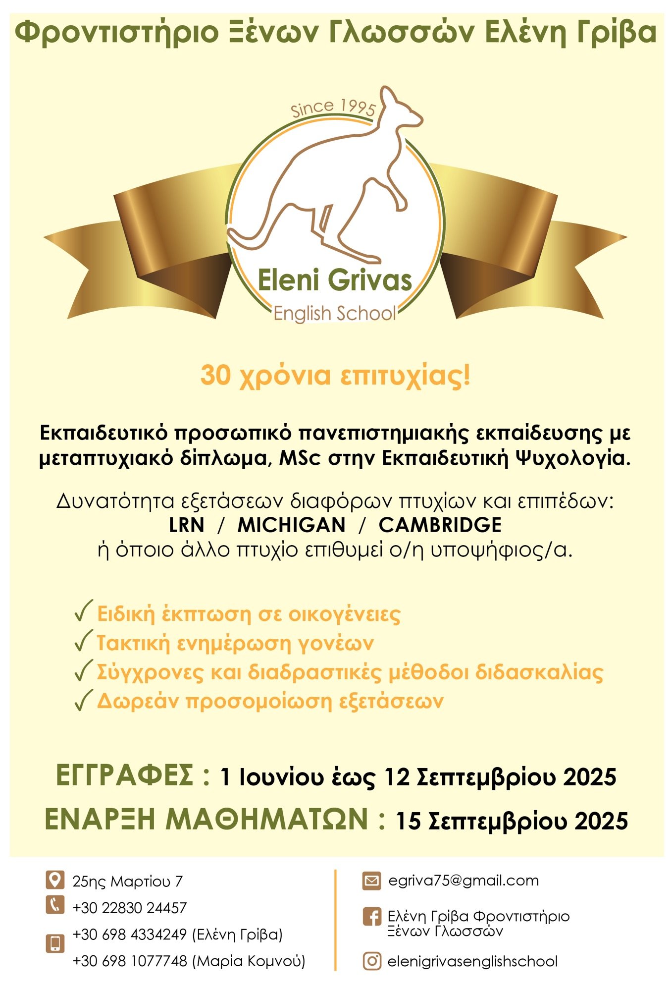 Το Φροντιστήριο Ξένων Γλωσσών Ελένη Γρίβα γιορτάζει φέτος 30 χρόνια συνεχούς επιτυχίας στον χώρο της ξενόγλωσσης εκπαίδευσης, προσφέροντας στους μαθητές του υψηλής ποιότητας διδασκαλία, με σύγχρονες μεθόδους και εξειδικευμένο προσωπικό.