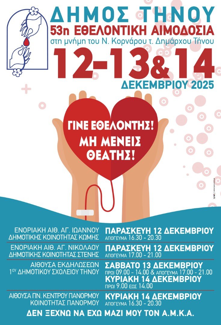 Ο Δήμος Τήνου διοργανώνει την 53η Εθελοντική Αιμοδοσία, αφιερωμένη στη μνήμη του Νικολάου Κορνάρου, πρώην Δημάρχου Τήνου, στις 12, 13 & 14 Δεκεμβρίου 2025. Με το μήνυμα «Γίνε εθελοντής – Μη μένεις θεατής!», καλούμε όλους τους συμπολίτες μας να συμμετάσχουν σε αυτή τη σπουδαία πράξη προσφοράς και αλληλεγγύης.