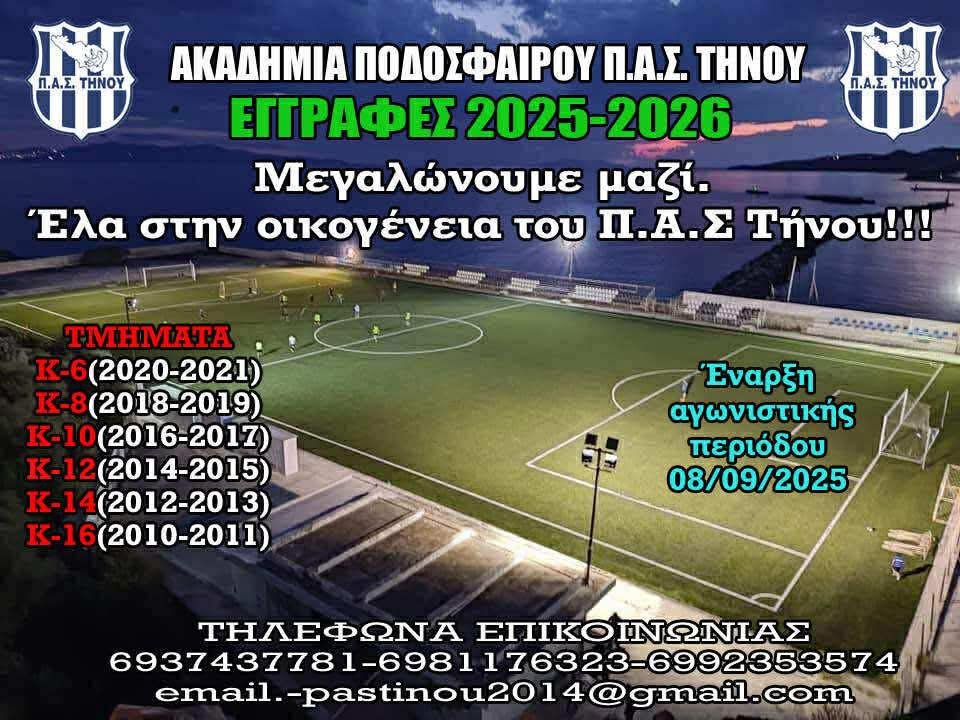 Ελάτε να χτίσουμε το μέλλον του Τηνιακού ποδοσφαίρου, με έμφαση στη σωστή αθλητική παιδεία, μέσα σε ένα δημιουργικό και ευχάριστο περιβάλλον!