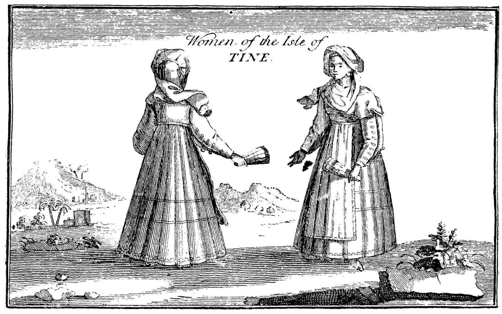 O Γάλλος περιηγητής φιλοξενεί πέντε εικόνες από την Τήνο: δύο απόψεις της πόλης και τρεις γυναικών (κυρίες της αριστοκρατίας, αστές και υπηρέτριες), κάτι που δε συμβαίνει με τα άλλα νησιά. Εδώ νεαρή αστή πλέκει έχοντας δίπλα την κόρη της και κουνώντας το μωρό της.