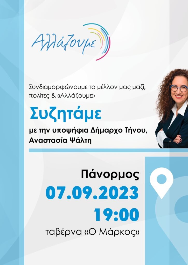 Η υποψήφια Δήμαρχος Τήνου, Αναστασία Ψάλτη και υποψήφιοι των ΑΛΛΑΖΟΥΜΕ θα βρεθούμε αύριο το απόγευμα (19.00) στον Πάνορμο (ταβέρνα ο «Μάρκος») για να συζητήσουμε με τους κατοίκους τα προβλήματα, τις απόψεις και τις προτεραιότητές τους και να παρουσιάσουμε τις λύσεις που προτείνουμε και τις προτάσεις μας για να αλλάξουμε την Τήνο.