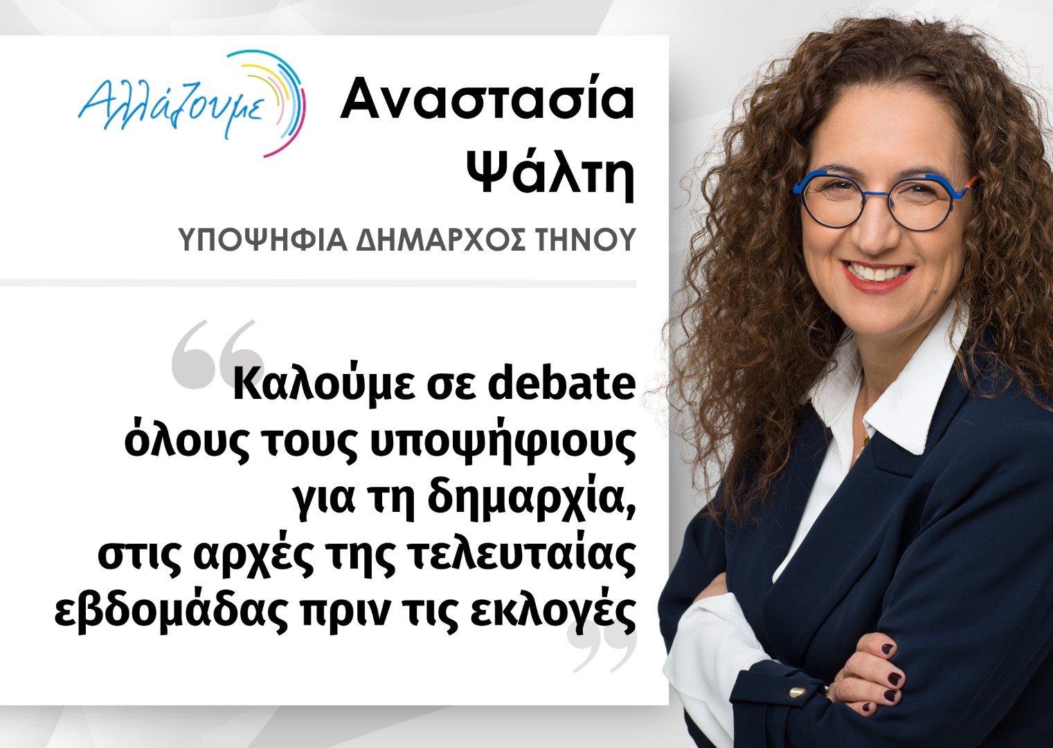 Με επιστολή προς τους ανθυποψηφίους της, Άννα Μαραβέλια, Πέτρο Κουσουνάδη, Παναγιώτη Κροντηρά και Ιωάννη Σιώτο, η επικεφαλής των ΑΛΛΑΖΟΥΜΕ και υποψήφια Δήμαρχος Τήνου, Αναστασία Ψάλτη, τους καλεί σε debate, στις αρχές της τελευταίας εβδομάδας πριν τις εκλογές της Κυριακής 8 Οκτωβρίου. Η ίδια τονίζει, στην επιστολή της, ότι θεωρεί κοινό στόχο των διεκδικητών της δημαρχίας την πληρέστερη δυνατή ενημέρωση των δημοτών και την ενίσχυση του δημοκρατικού διαλόγου, ενώ δηλώνει