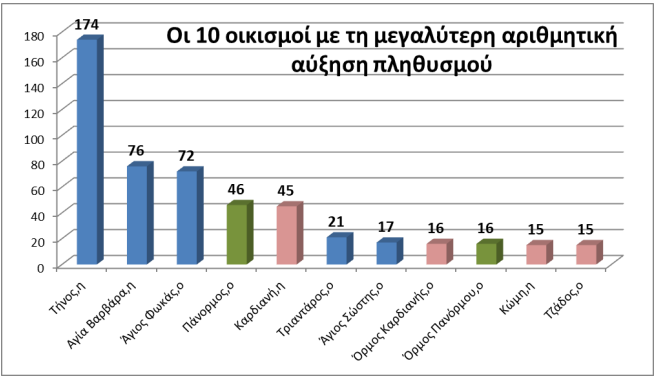 Οι 32 οικισμοί εμφανίζουν αύξηση 636 ατόμων συνολικά, ενώ οι 29 συνολική μείωση 339 ατόμων. Το γενικό ισοζύγιο της δεκαετίας είναι θετικό αλλά αυτοί που μειώνονται περισσότερο είναι οι παραδοσιακοί οικισμοί της ενδοχώρας. Αντίθετα υπάρχει διαχρονικά σταθερή αύξηση στην πόλη της Τήνου όπως και στους οικισμούς που αναπτύσσονται δορυφορικά από αυτή και αποτελούν σχεδόν τα προάστια της. Χαρακτηριστικό είναι ότι η ψαλίδα ανάμεσα στη Χώρα και όλους τους υπόλοιπους οικισμούς μεγαλώνει σε κάθε δεκαετία από το 1981 ως και σήμερα.