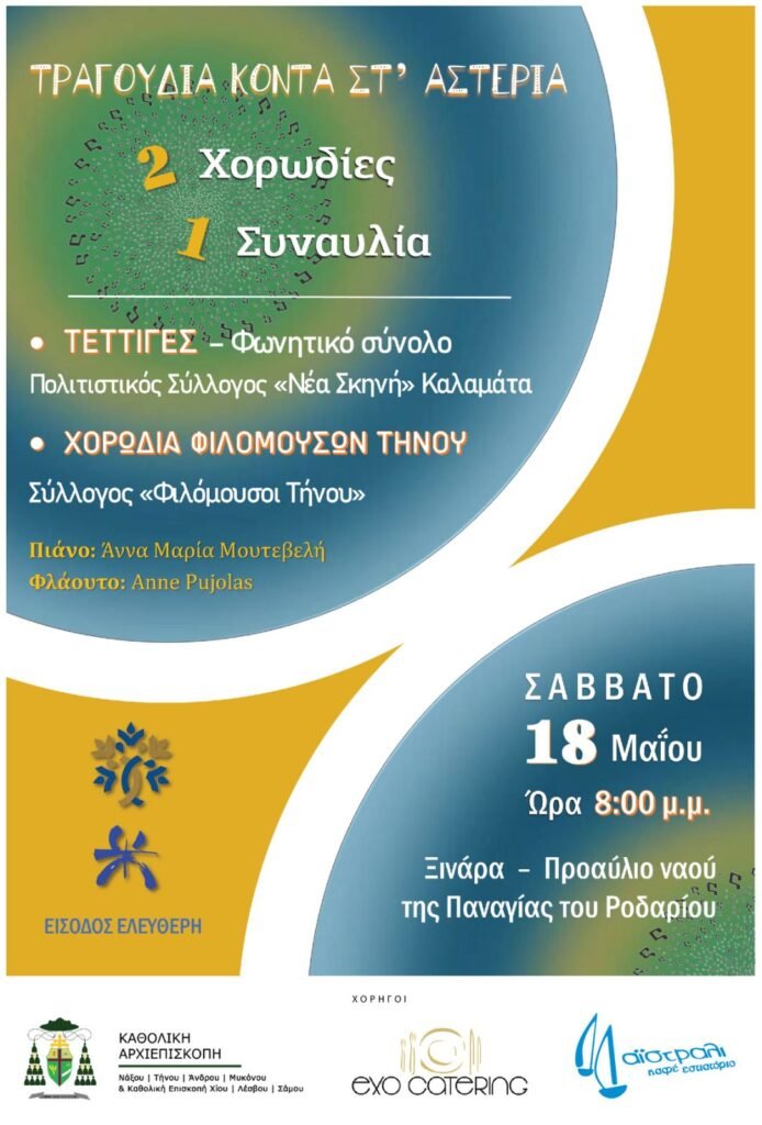 Η Χορωδία Φιλόμουσων Τήνου έχει τη χαρά και την τιμή να φιλοξενεί τους «Τέττιγες», το φωνητικό σύνολο του συλλόγου «Νέα Σκηνή» από την Καλαμάτα.