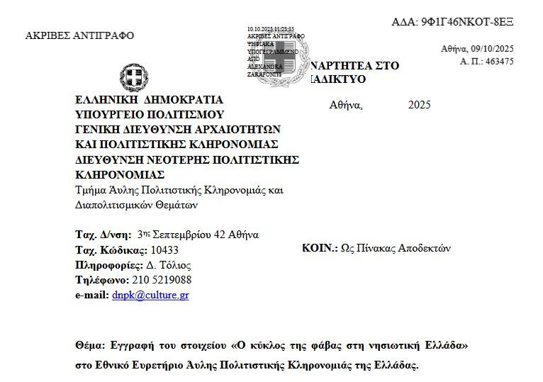 εγγραφή του στοιχείου «Ο κύκλος της φάβας στη Νησιωτική Ελλάδα» στο Εθνικό