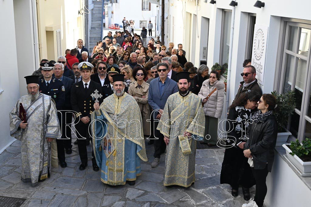Εν συνεχεία η λιτανευτική πομπή περιήλθε ανά τας οδούς της πόλης μέχρι τον Ιερό Μητροπολιτικό Ναό των Παμμεγίστων Ταξιαρχών, ενώ τα σκάφη ΠΛΣ-219 του Λιμενικού Σώματος και το Νήσος Τήνος απέδιδαν τιμάς.