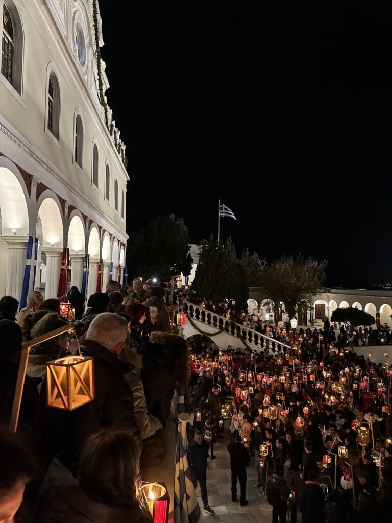 «Από μικροί ακούγαμε αυτήν την ιστορία, ότι όταν βρέθηκε η εικόνα, οι κάτοικοι πήραν τα φαναράκια που φώτιζαν τα σπίτια τους και βγήκαν στους δρόμους να γιορτάσουν», λέει η Μαρία Μωραΐτη, 39 ετών, κάτοικος και επιχειρηματίας στο νησί, στον κλάδο του τουρισμού και της εστίασης. «Ολοι λαχταρούν κάθε χρόνο να έρθουν στο νησί τέτοια μέρα. Για εμάς, εκτός από θρησκευτική γιορτή, είναι και μια μέρα που σηματοδοτεί τη νέα πορεία που χάραξε το νησί μας, προσελκύοντας επισκέπτες από όλα τα μέρη του κόσμου που έρχονται να προσκυνήσουν την Παναγία. Ολο αυτό έδωσε σε εμάς τους νέους την ευκαιρία να μπορούμε να οραματιζόμαστε επαγγελματικά κάτι πέρα από τις ασχολίες των παππούδων μας στα χωράφια και τα καΐκια».