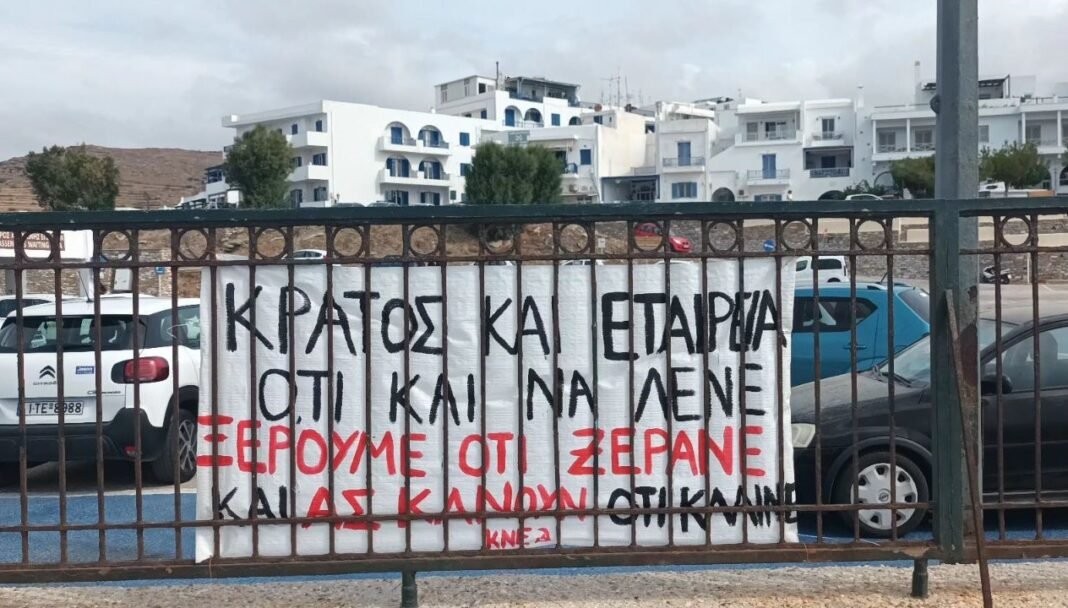 Η Οργάνωση της ΚΝΕ στην Τήνο κρέμασε συμβολικά ένα πανό στο λιμάνι για να εκφράσει την οργή της νεολαίας και όχι μόνο για τη στυγνή δολοφονία του 36χρονου Αντώνη Καργιώτη.