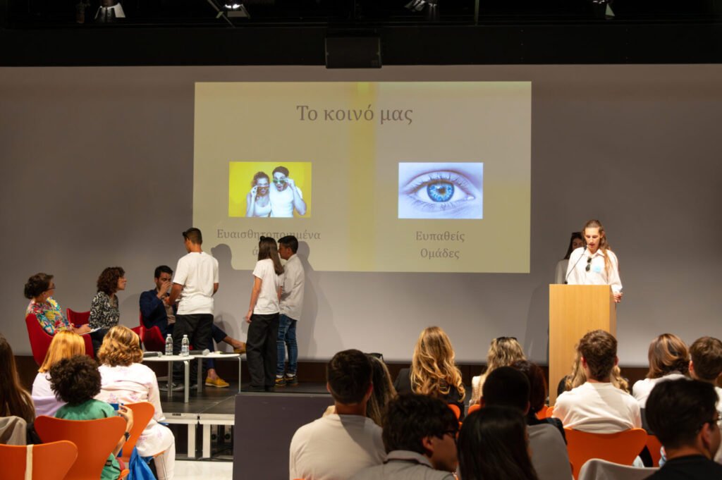 Στη συνέχεια όλες οι ομάδες παρουσίασαν την ιδέα τους και απάντησαν σε ερωτήσεις της κριτικής επιτροπής. Η ομάδα του Γυμνασίου παρουσίασε την ιδέα ενός προγράμματος επισκευής και επαναχρησιμοποίησης γυαλιών οράσεως με στόχο την υποστήριξη ατόμων από ευπαθείς ομάδες, που δεν έχουν τη δυνατότητα να προμηθεύονται καινούργιους σκελετούς. Η πρόταση, εκτός από την κοινωνική προσφορά, στοχεύει και στην ανάδειξη του πολιτισμού της Τήνου, αφού τα παιδιά προτείνουν οι ανακατασκευασμένοι ή επισκευασμένοι σκελετοί να διακοσμούνται με τα ονόματα χωριών της Τήνου, ώστε να προβάλλονται οι ομορφιές του τόπου μας.