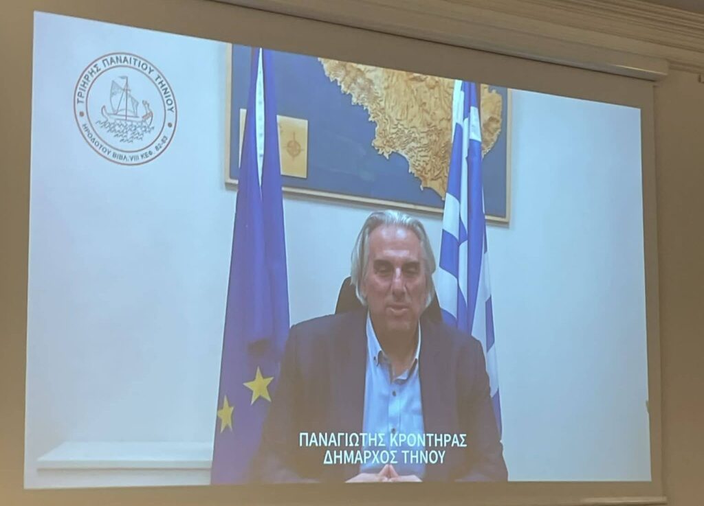 Χαιρετισμό, μέσω βιντεοσκοπημένου μηνύματος, απηύθυνε ο Δήμαρχος Τήνου Παναγιώτης Κροντηράς, ο οποίος ανέφερε ότι ήταν βαθιά επιθυμία του να παρευρίσκεται στην εκδήλωση, αλλά μία από μηνών προγραμματισμένη δικαστική υποχρέωση η οποία σχετίζεται με την εγκατάσταση ανεμογεννητριών στο νησί και η οποία ανεβλήθη και προγραμματίστηκε εκ νέου αυτήν την χρονική περίοδο, του στέρησε την χαρά της παρουσίας του. Στο μήνυμά του ο Δήμαρχος Τήνου ανέφερε ότι η σχέση Κωνσταντινούπολης και Τήνου είναι μακραίωνη και ουσιαστική. Από το 1824, με την Εύρεση της Αγίας Εικόνας και την ανέγερση του Ιερού Ναού της Ευαγγελίστριας στην Τήνο, τα πλοία τα οποία μετέφεραν τους πολυάριθμους προσκυνητές , συνέδεαν την Τήνο με το Αιγαίο, την ηπειρωτική Ελλάδα, την Μικρά Ασία, την Αίγυπτο, και φυσικά την Κωνσταντινούπολη. Η Τήνος είναι ο τόπος ο οποίος συνδέθηκε με την αναγέννηση των Ελλήνων, με βάση το θεϊκό σημάδι της Εύρεσης της Αγίας Εικόνας της Παναγίας. Είναι ο τόπος όπου, μέχρι τον ξεριζωμό και την Μικρασιατική Καταστροφή, ο μικρασιατικός ελληνισμός εκτελούσε το τάμα του και την θρησκευτική του υποχρέωση, ερχόμενος στην Τήνο με βαθιά πίστη και με ελπίδα. Το μήνυμα του Δημάρχου Τήνου έκλεισε με την βαθιά επιθυμία ώστε η συνάντηση αυτή να αποτελέσει αφορμή για ακόμη στενότερους δεσμούς, για ανταλλαγή ιδεών και για την ανάδειξη της Τήνου ως τόπου Πολιτισμού, Δημιουργίας και Εξωστρέφειας, και με τις ιδιαίτερες ευχαριστίες προς τον κο Πρέσβη και τους εκλεκτούς ομιλητές της εκδήλωσης.
