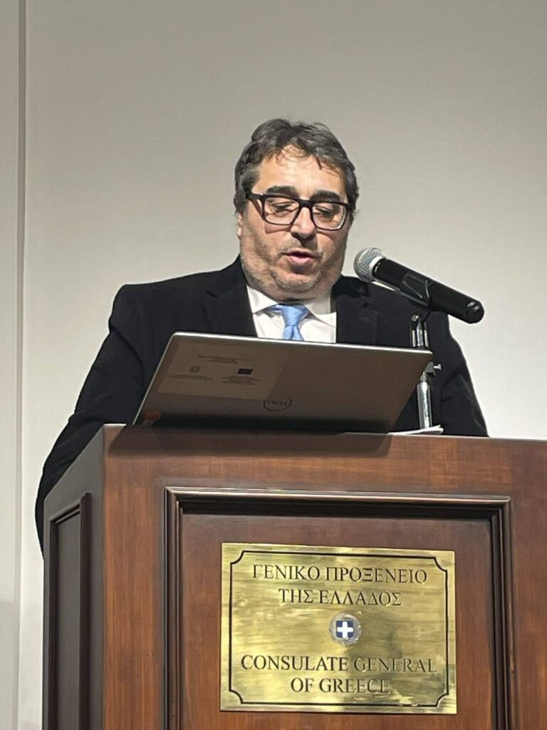 Καλωσορίζοντας τους εκλεκτούς προσκεκλημένους στο Σισμανόγλειο Μέγαρο, ο πρέσβης κος Κωνσταντίνος Κούτρας, Γενικός Πρόξενος της Ελλάδας στην Κωνσταντινούπολη, αναφέρθηκε στην σημαντική ιστορική παρουσία των Ελλήνων στην Κωνσταντινούπολη. Ιδιαίτερη μνεία έκανε στους Τηνιακούς, οι οποίοι άφησαν το δικό τους ξεχωριστό αποτύπωμα στην Πόλη, κυρίως μέσα από την τέχνη της μαρμαρογλυπτικής αλλά και την επιχειρηματική τους δραστηριότητα. Τόνισε, επίσης, ότι η συμβολή τους αποτελεί ένα σημαντικό και συχνά παραγνωρισμένο κεφάλαιο της ιστορίας του Ελληνισμού της Κωνσταντινούπολης, υπογραμμίζοντας πως το αποτύπωμα της ελληνικής παρουσίας στην Πόλη παραμένει ορατό μέχρι και σήμερα.
