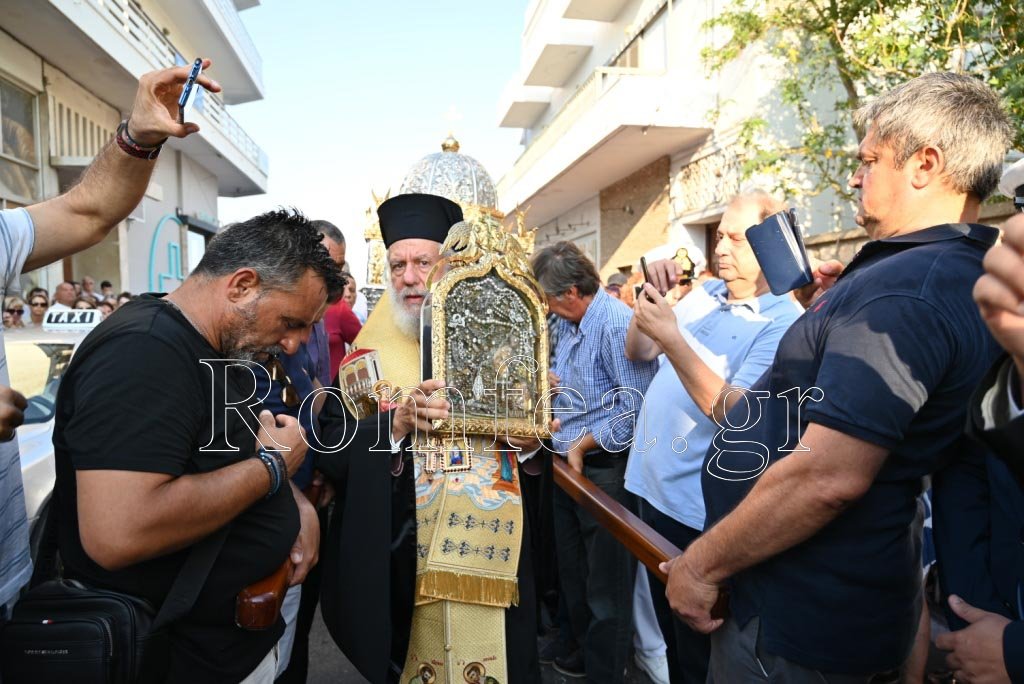 Στην ομιλία του ο Σεβ. κ. Δωρόθεος Β΄ αναφέρθηκε στην μεγάλη αξία των προσευχών των Οσίων και των Αγίων της Εκκλησίας προς τον Θεό και τους ανθρώπους, στην οσιακή και ασκητική ζωή της Οσίας Πελαγίας η οποία παιδιόθεν εζήλωσε την βιωτή των μεγάλων ασκητών και ως καρπός της αφοσιώσεώς της ήτο το Άγιο Όραμα δια του οποίου ενεφανίσθη η Αγία Εικόνα από τα σπλάχνα της γης της Τήνου και επί 202 χρόνια αποτελεί μέχρι σήμερα την διαβεβαίωση τον λόγο του Κυρίου ότι «Οὐκ ἐάσω ὑμᾶς ὀρφανούς…» και πράγματι η στοργική μητέρα του επιβεβαιώνει κάθε ημέρα με την παρουσία της ότι ο Κύριος παρακολουθεί την ζωή μας την οποία ευλογεί και αγιάζει.Ευχαρίστησε την Ηγουμένη και τις αδελφές για την φιλοξενία και αναφέρθηκε για την μεγάλη σημασία που έχει το μοναστήρι της Κυρίας των Αγγέλων του Κεχροβουνίου το οποίο επί δέκα και πλέον αιώνες προσφέρει και συνεισφέρει πνευματική ανακούφιση και αναψυχή στους χιλιάδες προσκυνητές η οποίοι όπως είπε έρχονται εδώ για να ακούσουν από τις καλές γερόντισσες που ζουν και βιώνουν την εισάγγελη πολιτεία, λόγο ενισχυτικό και ειρηνικό.Το απόγευμα, τελέσθηκε στην Μονή της Οσίας Πελαγίας ο εσπερινός και εν συνεχεία δια χειρών των Ιερέων η Αγία Εικόνα πεζή επί δύο ώρες λιτανεύθηκε από εκεί έως την πόλη της Τήνου. Προ του εσπερινού πραγματοποιήθηκε η επίσκεψη της αγίας Εικόνας στα κελιά των ασθενουσών Μοναζουσών. Την λιτανεία συνόδευσαν χιλιάδες άνθρωποι κάθε ηλικίας και κατά την άφιξή της στον Ναό της Αγίας Παρασκευής στην πόλη σχηματίσθει λιτανευτική πομπή με κάθε εκκλησιαστική τάξη την οποία παρακολούθησαν όλες οι αρχές, η Οσιολογιωτάτη Ηγουμένη Μοναχή Ιουλιανή, ο Καθολικός Επίσκοπος κ. Ιωσήφ Πρίντεζης και Κληρικοί της Καθολικής Εκκλησίας, ο Βουλευτής των Κυκλάδων κ. Φόρτωμας Φίλιππος, ο Δήμαρχος Τήνου, η Αντιπεριφερειάρχη Υγείας και Κοινωνικής Μέριμνας και Επάρχου Τήνου, ο Διοικητής της 6ης ΠΕ.ΔΙ.Λ.Σ., ο Διοικητής των Υπηρεσιών της Αστυνομίας των Κυκλάδων, οι χωρικοί και οι θεματικοί Περιφερειάρχες Αιγίας, ο Αντιπρόεδρος της Διοικούσης Επιτροπής του Ιερού Ιδρύματος, ο Λιμενάρχης Τήνου, ο Διοικητής του ΑΤ Τήνου, ο Διοικητής της Πυροσβεστικής Υπηρεσίας Τήνου, εκπρόσωποι της Αδελφότητος του εν Αθήναις Τηνίων, μέλη της Διοικούσης Επιτροπής του ΠΙΙΕΤ, Πρόεδροι και μέλη Συλλόγων και Φορέων και χιλιάδες ευλαβείς Χριστιανοί, Τήνιοι και προσκυνητές.Στην μαρμάρινη εξέδρα ανεπέμφθη δέηση και στην συνέχεια εκφωνήθηκε πανηγυρικός λόγος από τον Σεβασμιώτατο Μητροπολίτη Σύρου και Τήνου κ. Δωρόθεο Β΄ ο οποίος αναφέρθηκε στην σκέπη και στην προστασία η οποία η Παναγία παρέχει στην ζωή των ανθρώπων και προέτρεψε όλους και κυρίως τους νέους την παρουσία των οποίων ιδιαιτέρως αναφέρθηκε να βρίσκονται κοντά στην Εκκλησία που είναι η Παναγία και να προσβλέπουν πάντοτε στην στοργική ματιά της από την οποία να παίρνουν δύναμη για την επίτευξη των στόχων τους.Παρακάλεσε τους πιστούς να προσευχηθούν για την Πατρίδα μας, για την κατάπαυση των πολέμων και ευχαρίστησε τους χιλιάδες προσκυνητές για την παρουσία τους που ενισχύουν το μεγάλο και φιλανθρωπικό έργο το οποίο επιτελεί το Ιερό Ίδρυμα από της συστάσεως του μέχρι σήμερα.Η αγία Εικόνα περιήλθε τα τέσσερα σημεία της μαρμάρινης εξέδρας φερομένης στους ώμους των ανδρών του Λιμεναρχείου Τήνου εις ευλογίαν των παρακολουθούντων χιλιάδων πιστών.Εν συνεχεία η Αγία Εικόνα επέστρεψ