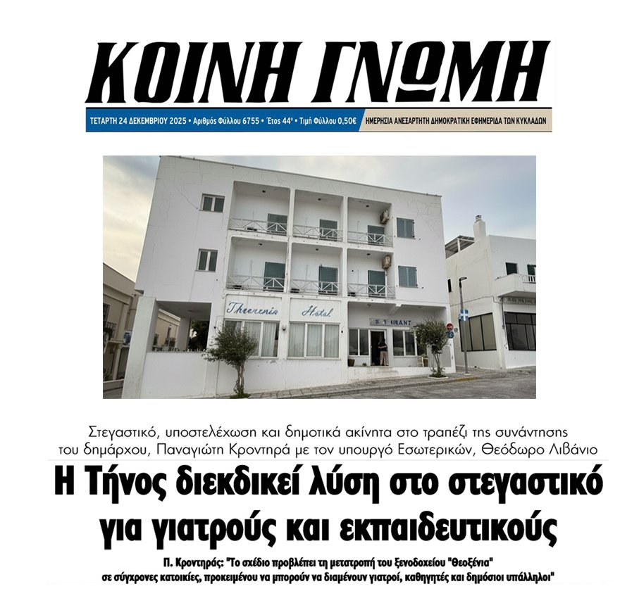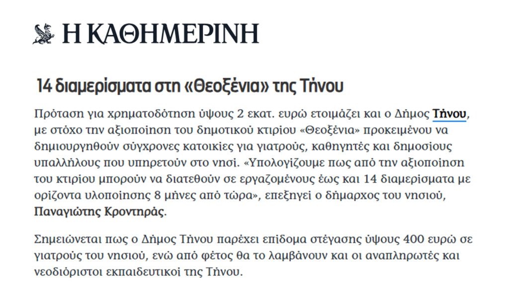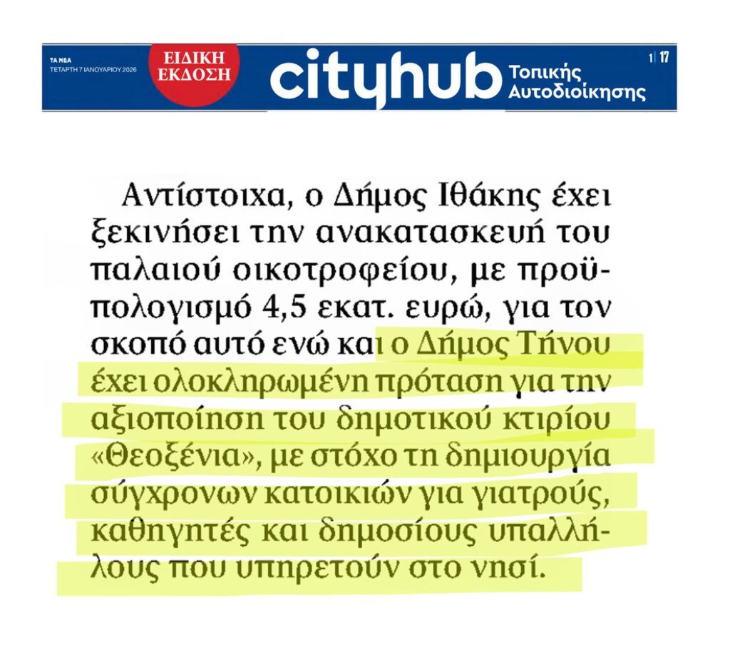 Τις τελευταίες ημέρες, η Τήνος μας βρέθηκε στο επίκεντρο του πανελλαδικού ενδιαφέροντος για έναν σκοπό που μας γεμίζει περηφάνια. Η πρόταση του Δήμου μας για την ανακατασκευή του εμβληματικού ξενοδοχείου «Θεοξένια» και τη μετατροπή του σε 14 σύγχρονες δημοτικές κατοικίες, έτυχε θερμής υποδοχής όχι μόνο από την Κυβέρνηση αλλά και από το σύνολο της ελληνικής κοινωνίας.