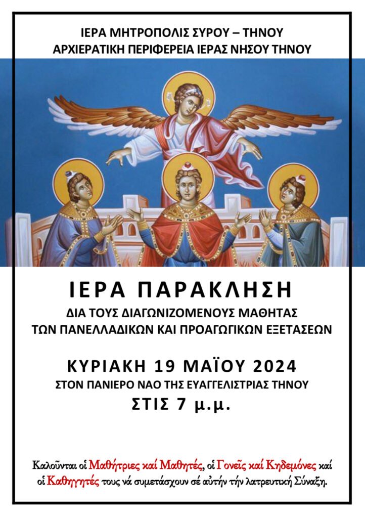 Καλοῦνται οἱ Μαθήτριες καί Μαθητές, οἱ Γονεῖς καί Κηδεμόνες καί οἱ Καθηγητές τους νά συμετάσχουν σέ αὐτήν τήν λατρευτική Σύναξη.