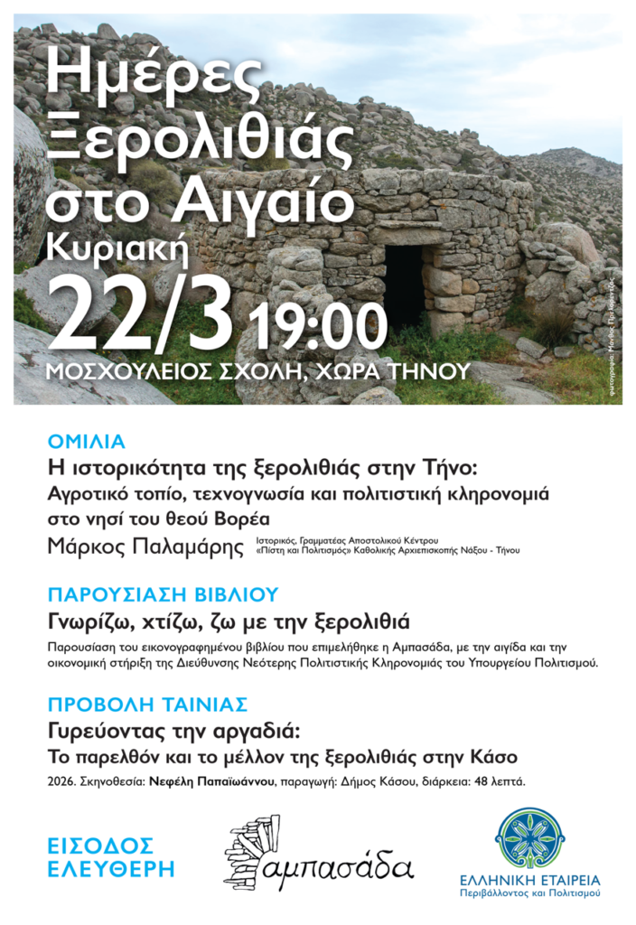 – Παρουσίαση του εικονογραφημένου βιβλίου «Γνωρίζω, χτίζω, ζω με την ξερολιθιά» που επιμελήθηκε η Αμπασάδα, με την αιγίδα και την οικονομική στήριξη της Διεύθυνσης Νεότερης Πολιτιστικής Κληρονομιάς του Υπουργείου Πολιτισμού»•