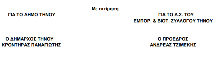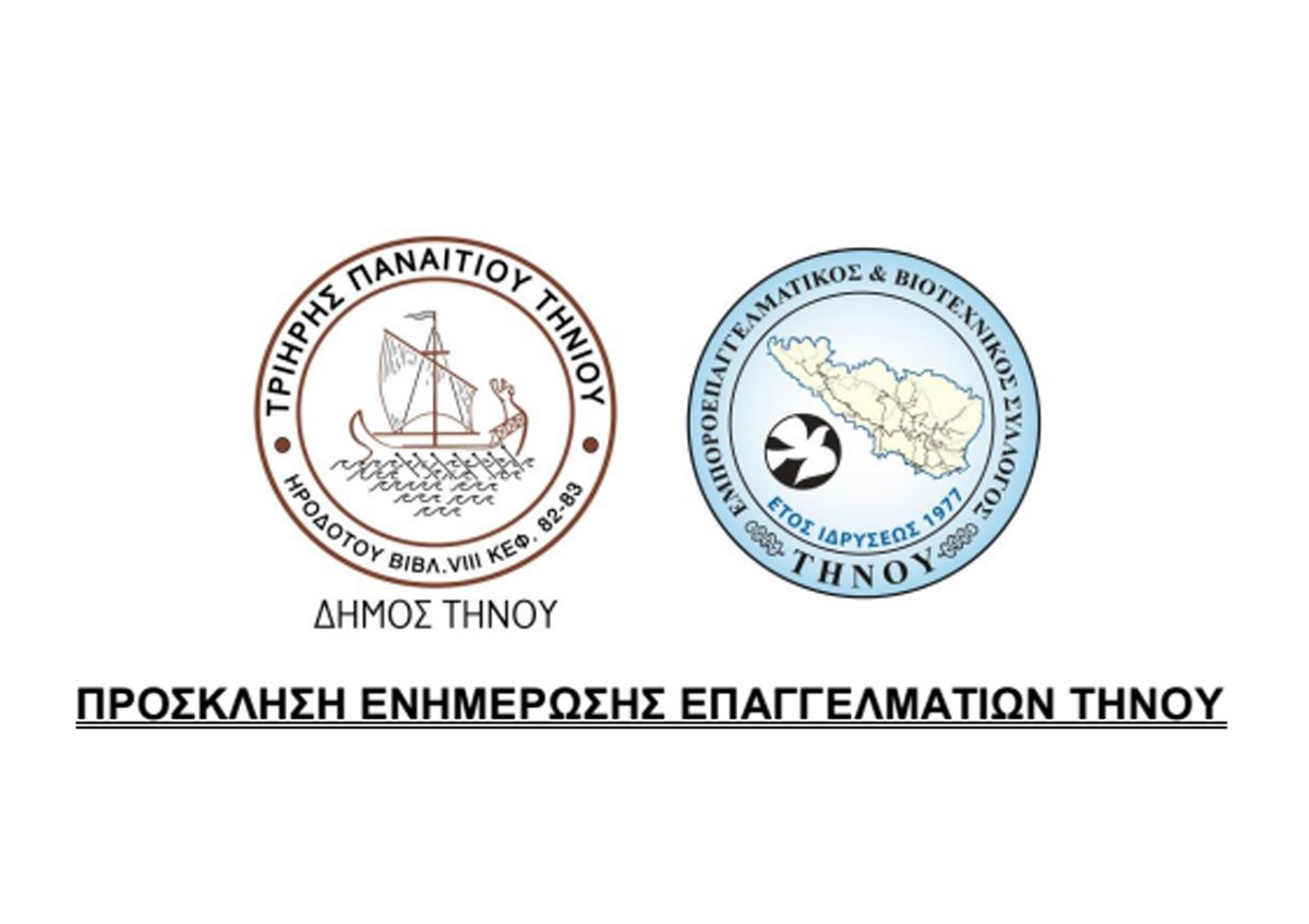 Ενόψει της έναρξης της θερινής σεζόν, ο Δήμος Τήνου και ο Εμποροεπαγγελματικός & Βιοτεχνικός Σύλλογος Τήνου προσκαλούν όλους τους επαγγελματίες με κάθε είδους δραστηριότητα, σε ημερίδα ενημέρωσης και συζήτησης για την εύρυθμη λειτουργία της αγοράς του νησιού μας.