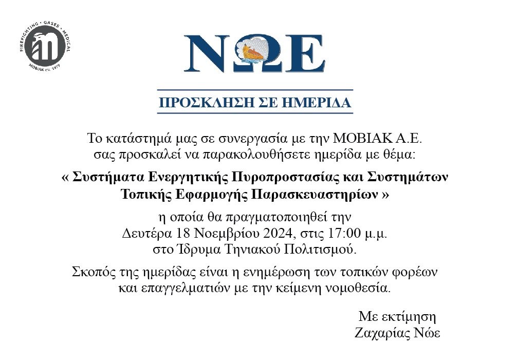 Το κατάστημα Νώε, σε συνεργασία με την εταιρεία MOBIAK Α.Ε., προσκαλεί τους ενδιαφερόμενους να παρακολουθήσουν ημερίδα με θέμα: «Συστήματα Ενεργητικής Πυροπροστασίας και Συστημάτων Τοπικής Εφαρμογής Παρασκευαστηρίων».