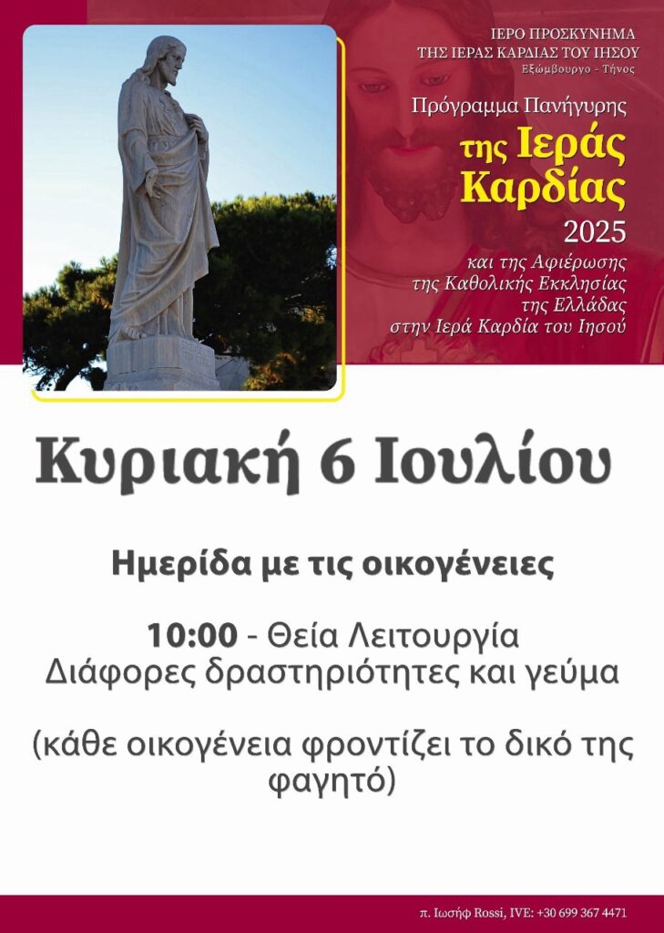Το Ιερό Προσκύνημα της Ιεράς Καρδίας του Ιησού στο Εξώμβουργο Τήνου διοργανώνει οικογενειακή ημερίδα την Κυριακή 6 Ιουλίου στο πλαίσιο της πανήγυρης του 2025.