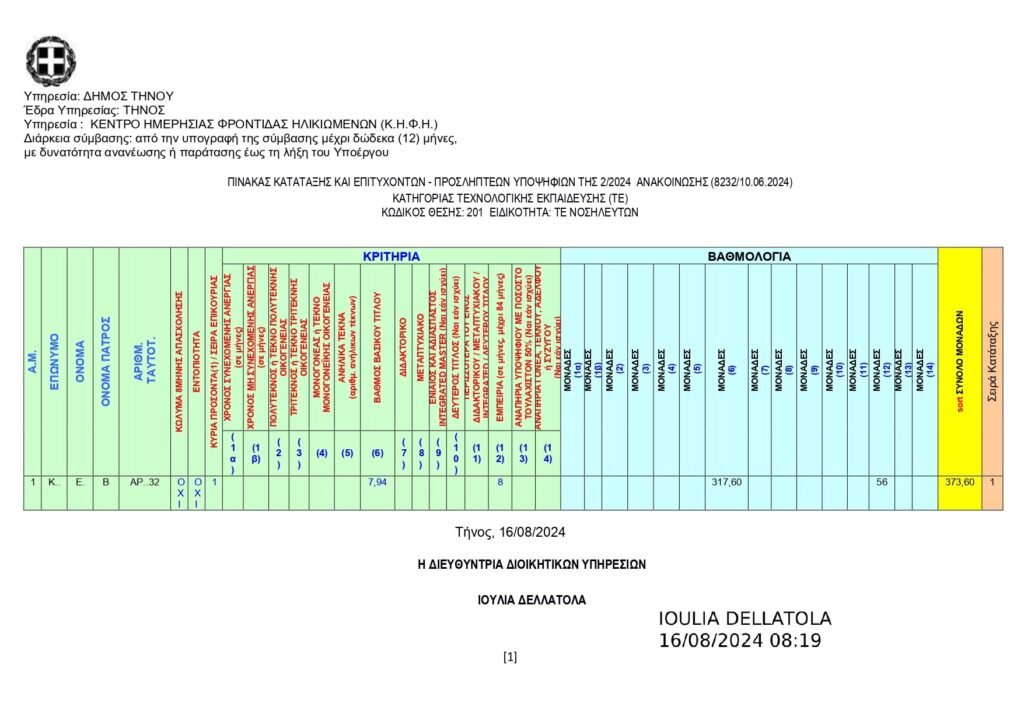 Πίνακας Κατάταξης & Επιτυχόντων – Προσληπτέων υποψηφίων την 2/2024 ανακοίνωσης(8232/10-06-2024) Κατηγορίας Τεχνολογικής Εκπαίδευσης (ΤΕ)