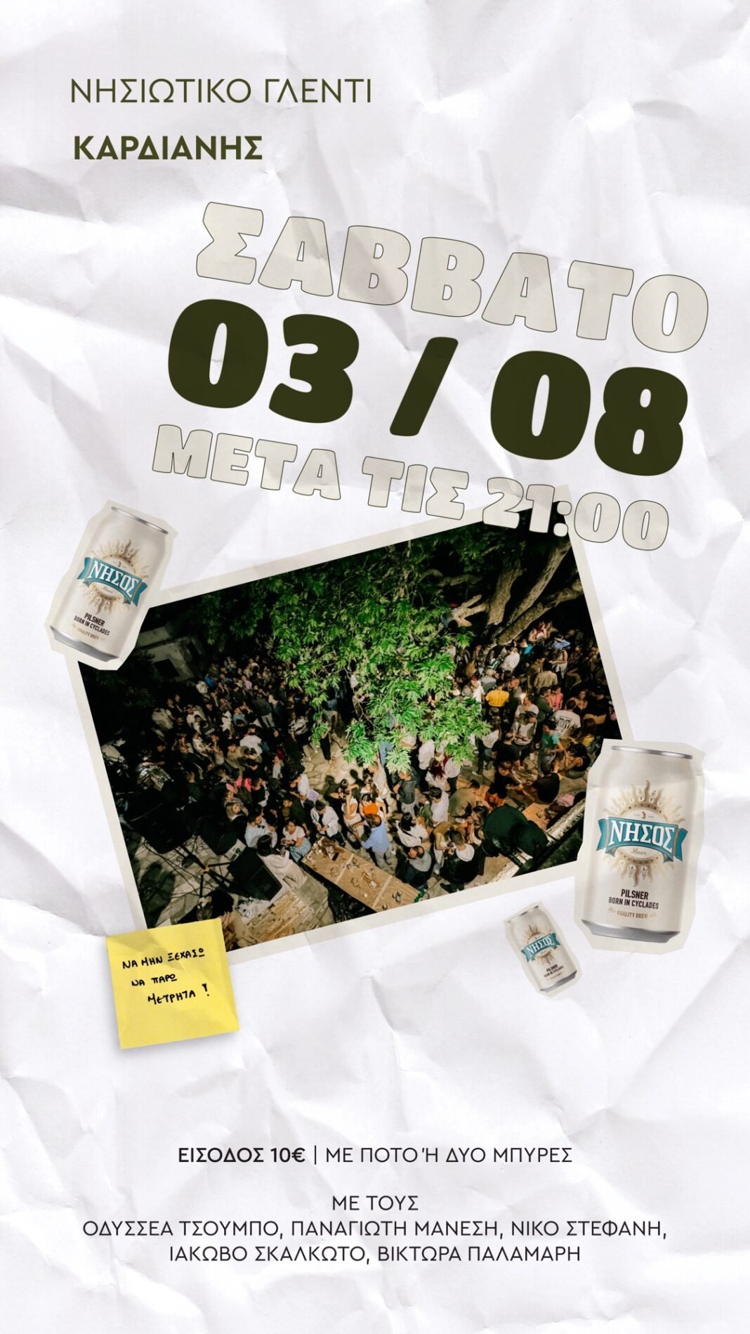Η Αδελφότητα Τηνίων Καρδιανιωτών σας προσκαλεί στο καλοκαιρινό της γλέντι, το Σάββατο 3 Αυγούστου 2024, μετά τις 21:00.