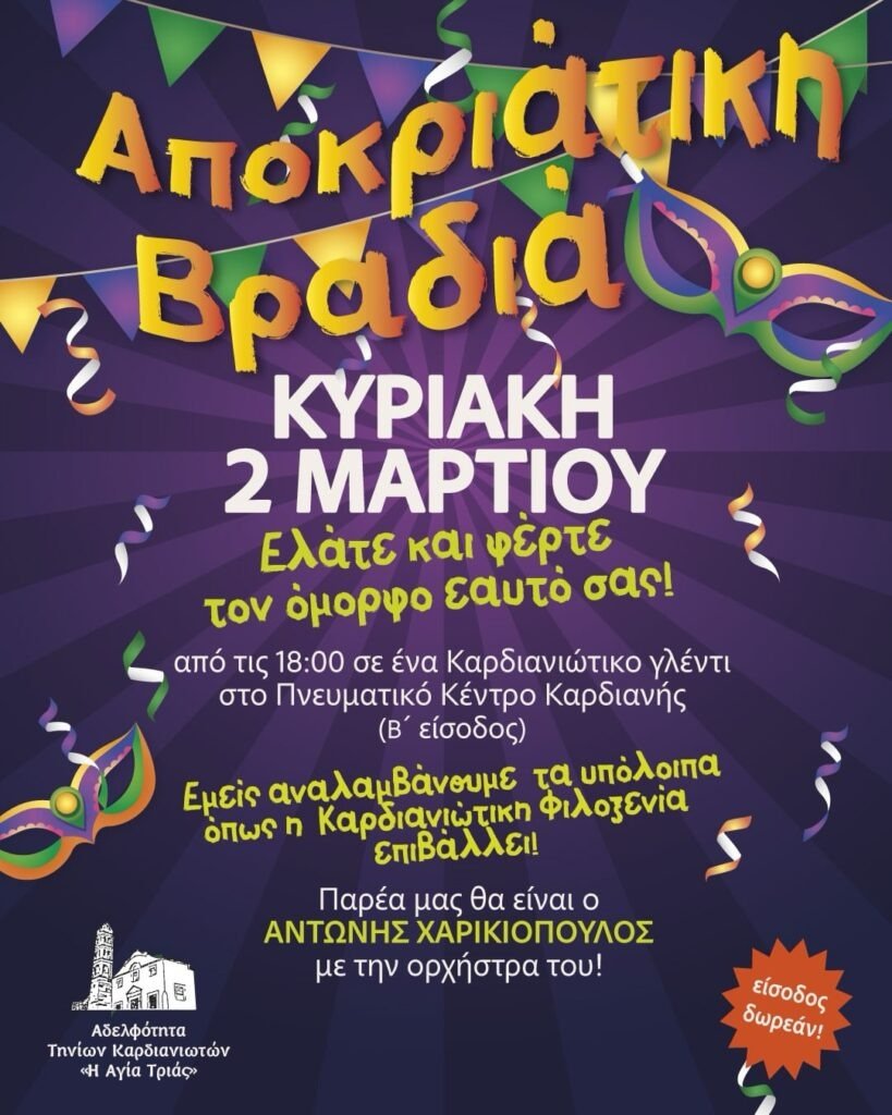 Από τις 18:00 σε ένα Καρδιανιώτικο γλέντι στο Πνευματικό Κέντρο Καρδιανής (Β’ είσοδος)