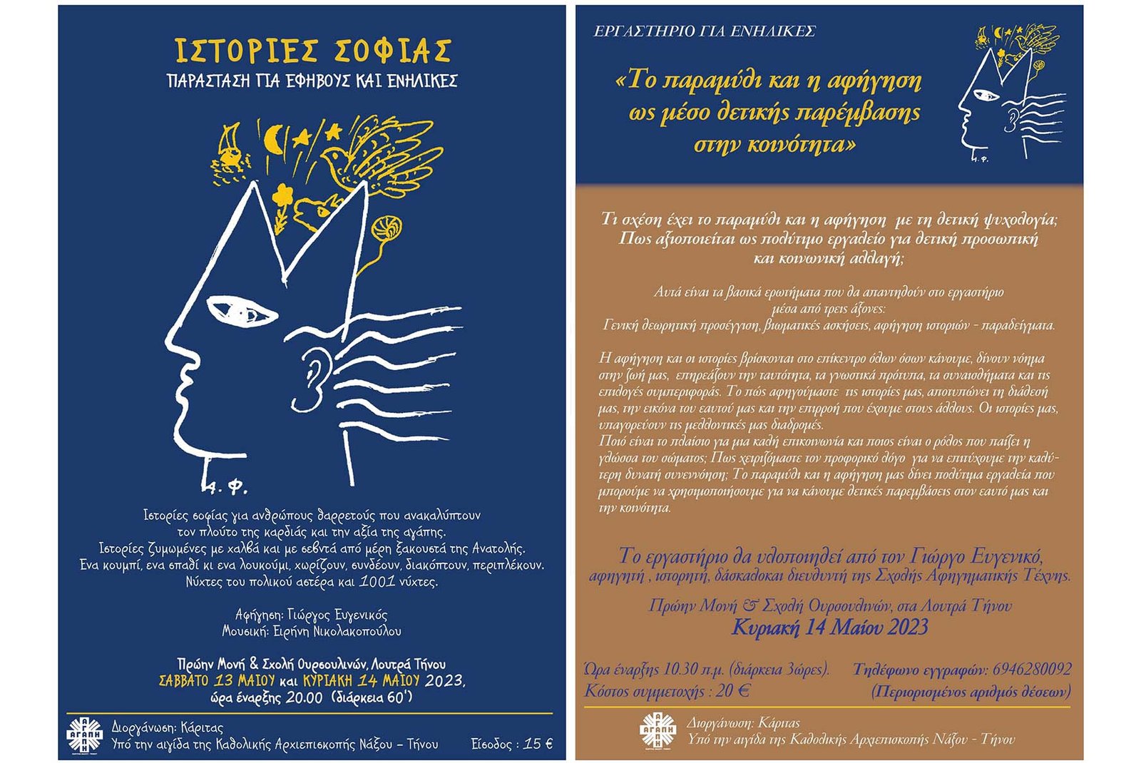 Αυτό το Σάββατο ή τη Κυριακή αξίζει να συμπεριλάβετε στο πρόγραμμά σας βραδυνή επίσκεψη στη πρώην Μονή & Σχολή Ουρσουλινών, στους υποβλητικούς χώρους της οποίας ο Γιώργος Ευγενικός θα μας ταξιδέψει με “Ιστορίες Σοφίας”. Επιπρόσθετα το πρωί της Κυριακής θα υλοποιηθεί εκπαιδευτικό σεμινάριο αφήγησης ενηλίκων. Ξεχωριστές δράσεις της τοπικής Κάριτας με την υποστήριξη της Καθολικής Αρχιεπισκοπής. (τηλέφωνο κρατήσεων – 6946280092 / ιδιαίτερα για το σεμινάριο αφήγησης λόγω περιορισμένου αριθμού θέσεων)