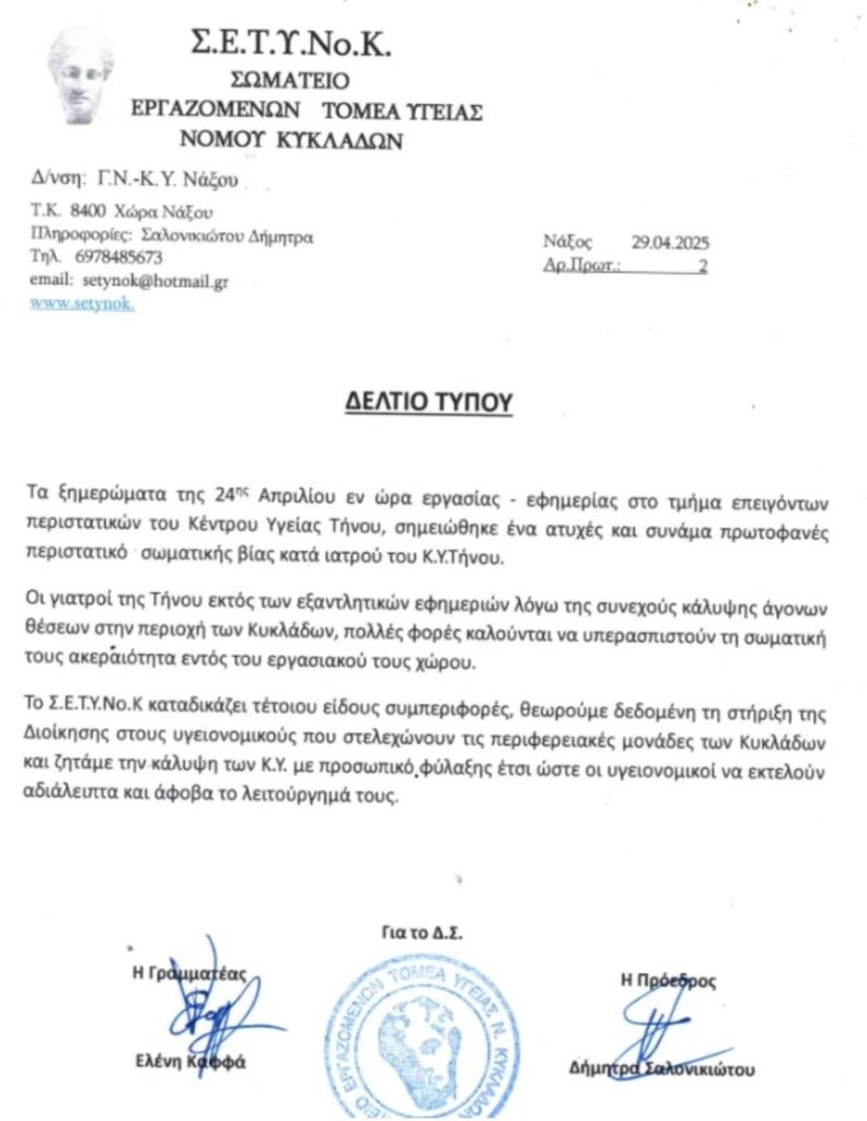 Όπως αναφέρεται στο δελτίο τύπου, οι γιατροί της Τήνου, πέρα από τις εξαντλητικές εφημερίες λόγω της υποστελέχωσης στα νησιά, συχνά καλούνται να προστατεύσουν τη σωματική τους ακεραιότητα εντός του χώρου εργασίας τους. Το Σωματείο καταδικάζει απερίφραστα τέτοιου είδους συμπεριφορές και ζητά την άμεση ενίσχυση της φύλαξης στις περιφερειακές μονάδες υγείας των Κυκλάδων, ώστε οι υγειονομικοί να μπορούν να εκτελούν τα καθήκοντά τους με ασφάλεια και αξιοπρέπεια.
