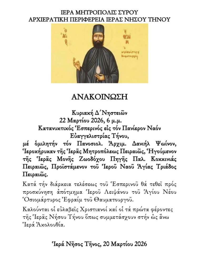 Κατανυκτικός Εσπερινός εις τον Πανίερος Ναόν Ευαγγελιστρίας Τήνου