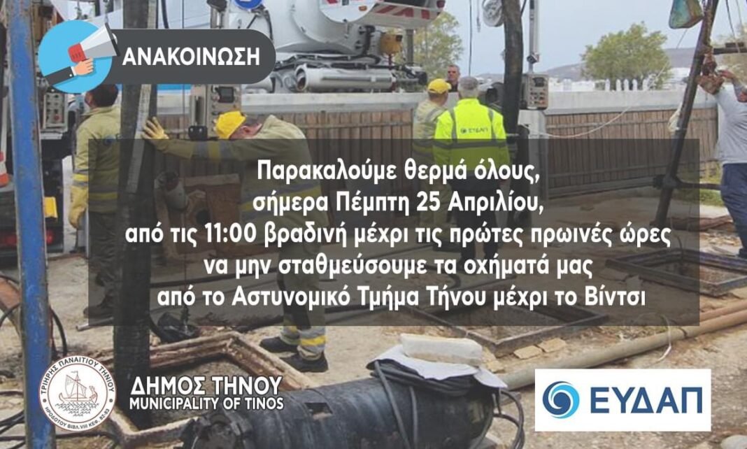 Προκειμένου λοιπόν να εργασθούν απρόσκοπτα και αποτελεσματικά παρακαλούμε θερμά όλους, σήμερα Πέμπτη 25 Απριλίου, από τις 11:00 βραδινή μέχρι τις πρώτες πρωινές ώρες να μην σταθμεύσουμε τα οχήματά μας από το Αστυνομικό Τμήμα Τήνου μέχρι την περιοχή «Βίντσι»,. ώστε να διευκολύνουμε το έργο τους, η επιτυχία του οποίου είναι σημαντική και καθοριστική για την καθημερινότητα όλων μας.