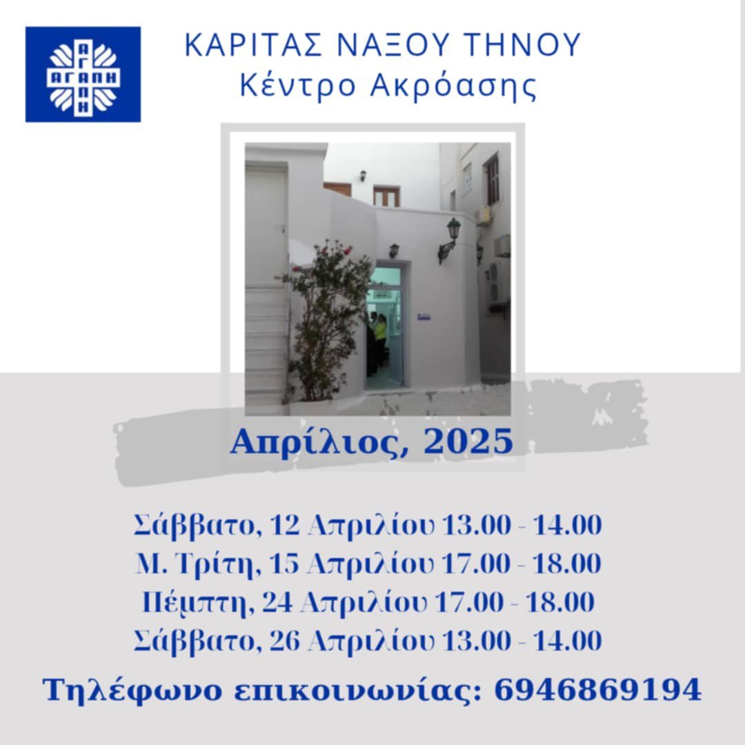 Το Κέντρο Ακρόασης της Κάριτας Νάξου-Τήνου συνεχίζει τη δράση του παρέχοντας υποστήριξη και αλληλεγγύη σε όσους το έχουν ανάγκη. Το πρόγραμμα συναντήσεων για τον Απρίλιο 2025 είναι το εξής: