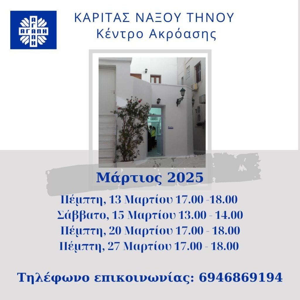 Κέντρο Ακρόασης Καρίτας Νάξου Τήνου: Πρόγραμμα Μαρτίου 2025