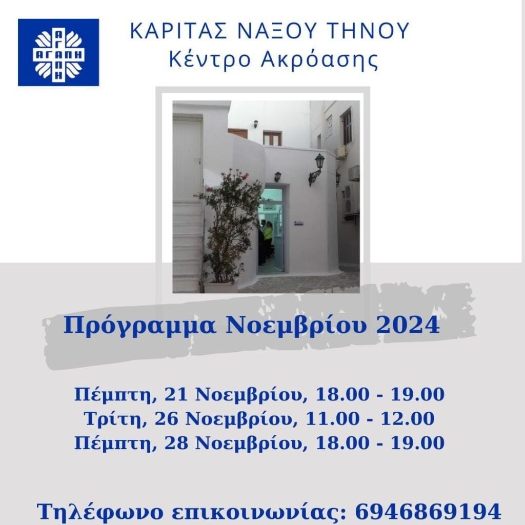 Το Κέντρο Ακρόασης της Κάριτας Νάξου-Τήνου συνεχίζει τη δράση του παρέχοντας υποστήριξη και αλληλεγγύη σε όσους το έχουν ανάγκη. Το πρόγραμμα συναντήσεων για τον Νοέμβριο 2024 είναι το εξής: