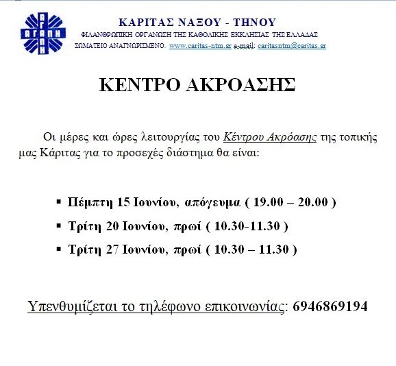 Κέντρο ακρόασης της τοπικής Κάριτας Νάξου Τήνου για τον μήνα Ιούνιο