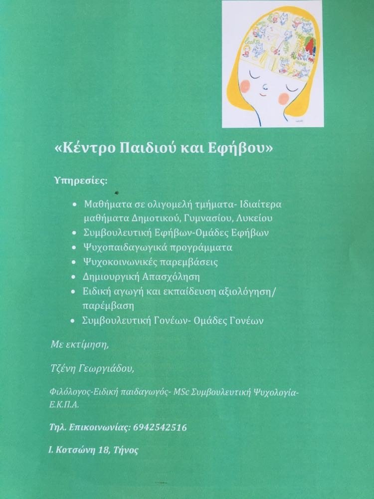 Φιλόλογος-Ειδική παιδαγωγός- MSc Συμβουλευτική Ψυχολογία- Ε.Κ.Π.Α.  Τηλ. Επικοινωνίας: 6942542516, Ι. Κοτσώνη 18, Τήνος
