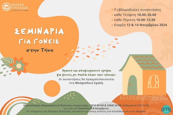 Το Κέντρο Πρόληψης «ΘΗΣΕΑΣ ΚΥΚΛΑΔΩΝ» πρόκειται να υλοποιήσει σεμινάρια για γονείς στην Τήνο με στόχο την υποστήριξη τους στον ιδιαίτερα απαιτητικό και συνάμα ενδιαφέροντα ρόλο τους, όπως αυτός διαμορφώνεται στη σημερινή πραγματικότητα.