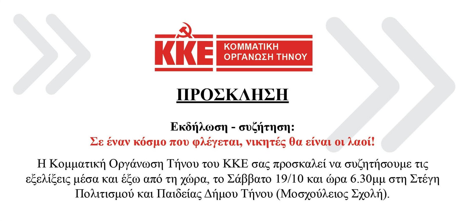Η Κομματική Οργάνωση Τήνου του ΚΚΕ σας προσκαλεί να συζητήσουμε τις εξελίξεις μέσα και έξω από τη χώρα, το Σάββατο 19/10 και ώρα 6.30μμ στη Στέγη Πολιτισμού και Παιδείας Δήμου Τήνου (Μοσχούλειος Σχολή).