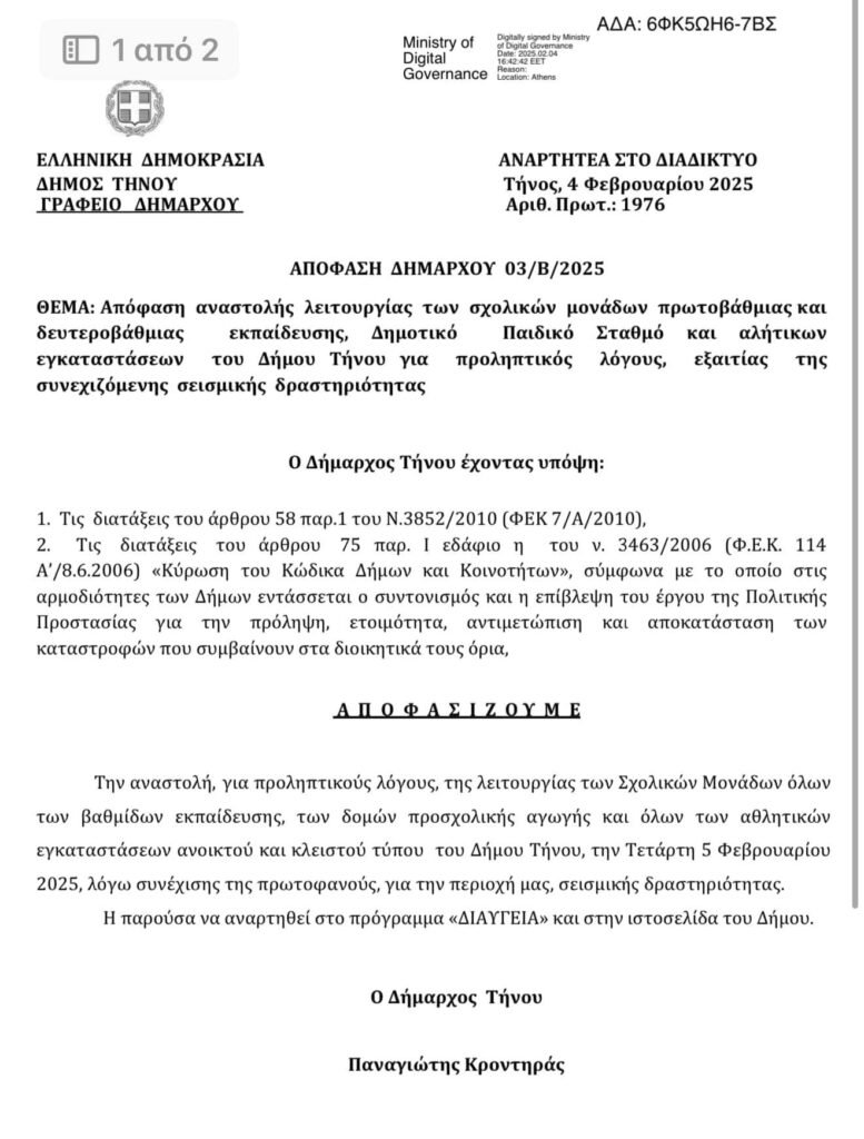 Με απόφαση του Δημάρχου Τήνου Παναγιώτη Κροντηρά, λόγω της συνεχιζόμενης έντονης σεισμικής δραστηριότητας που παρατηρείται τις τελευταίες ημέρες στις Νότιες Κυκλάδες και συγκεκριμένα στο θαλάσσιο χώρο μεταξύ Σαντορίνης και Αμοργού, αναστέλλεται η λειτουργία όλων των σχολικών μονάδων του νησιού, του Δημοτικού Παιδικού Σταθμού και όλων των αθλητικών εγκαταστάσεων ανοικτού και κλειστού τύπου και για αύριο Τετάρτη 5 Φεβρουαρίου 2025, για προληπτικούς λόγους και δεδομένου ότι οι εν λόγω εγκαταστάσεις συγκεντρώνουν μεγάλο αριθμό ατόμων.