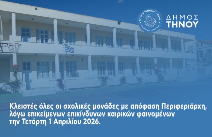 Με απόφαση του Περιφερειάρχη Γιώργου Χατζημάρκου, όλες οι σχολικές μονάδες θα παραμείνουν κλειστές την Τετάρτη 1 Απριλίου 2026, λόγω των επικείμενων επικίνδυνων καιρικών φαινομένων. Η απόφαση ελήφθη με γνώμονα την προστασία της ασφάλειας μαθητών, εκπαιδευτικών και πολιτών.