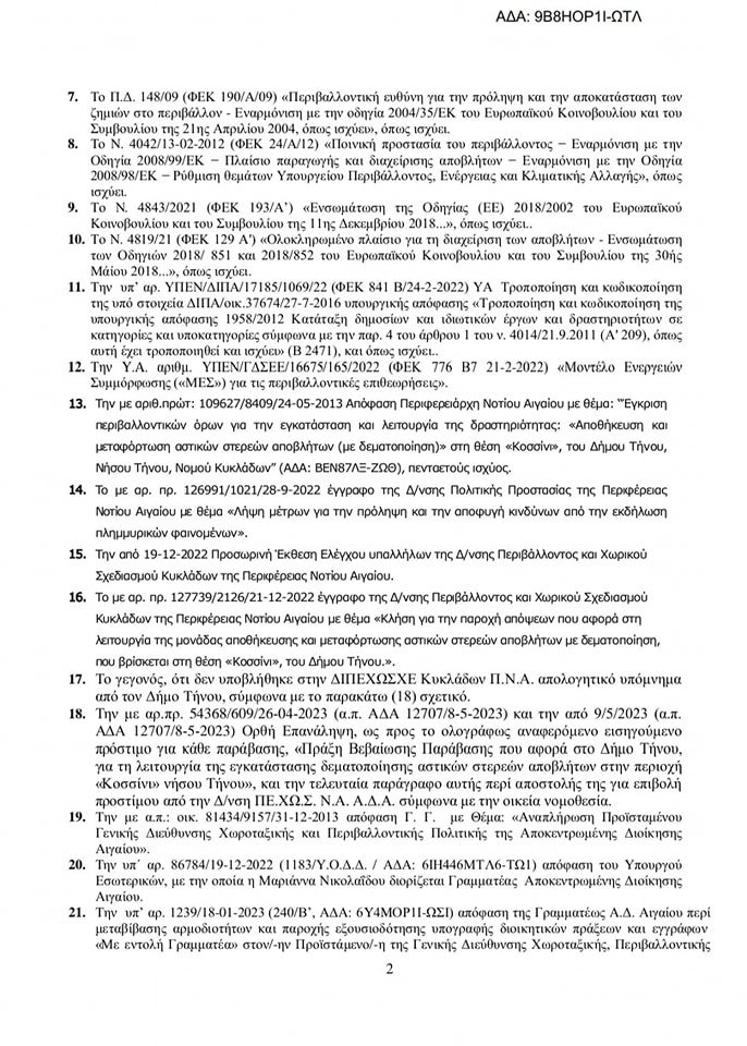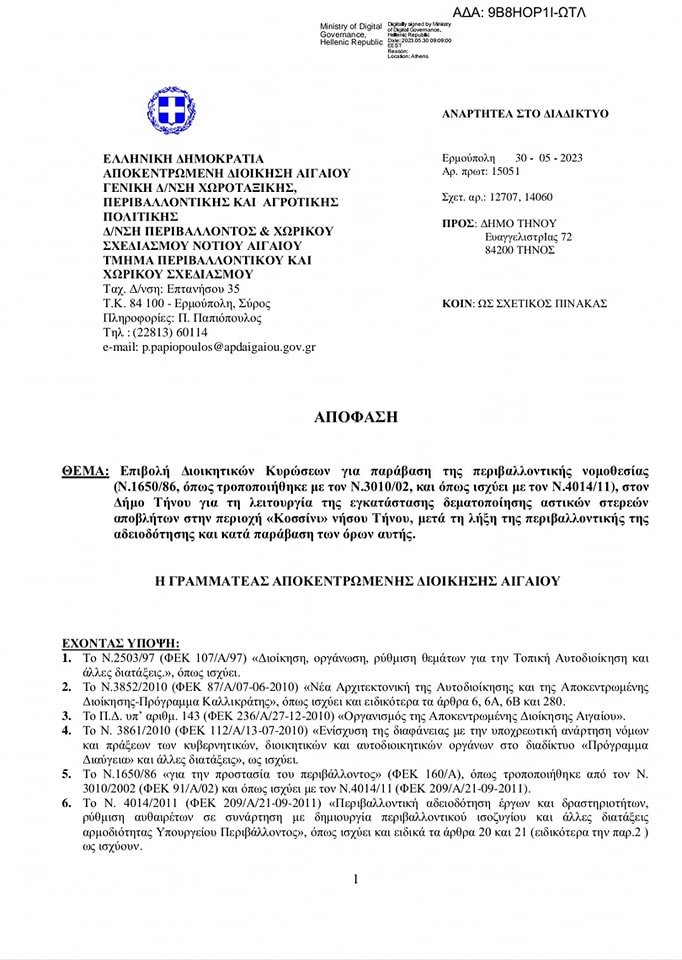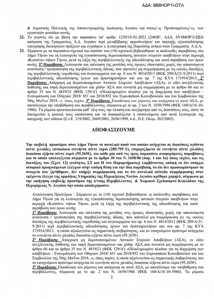 Με ανάρτηση στη σελίδα της το Κοινό Τηνίων αναφέρει για το πρόστιμο του Δήμου Τήνο στην περιοχή «Κοσσίνι». Πιο συγκεκριμένα αναφέρει: