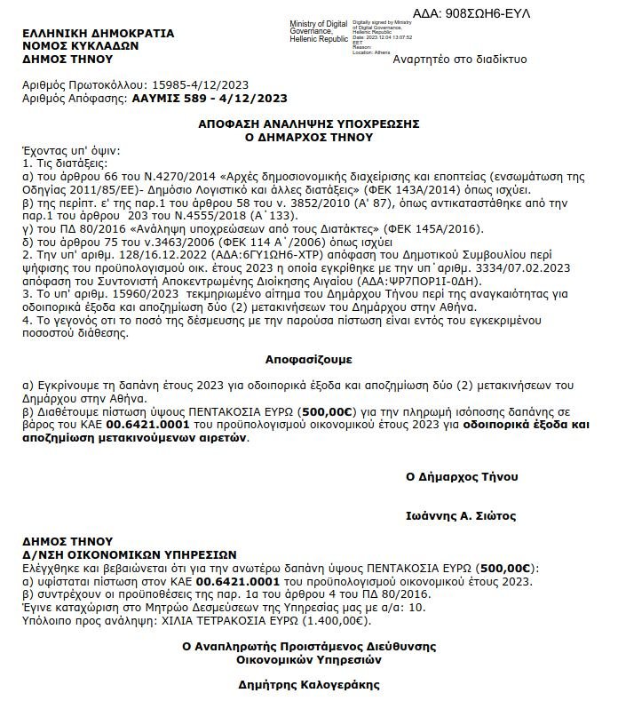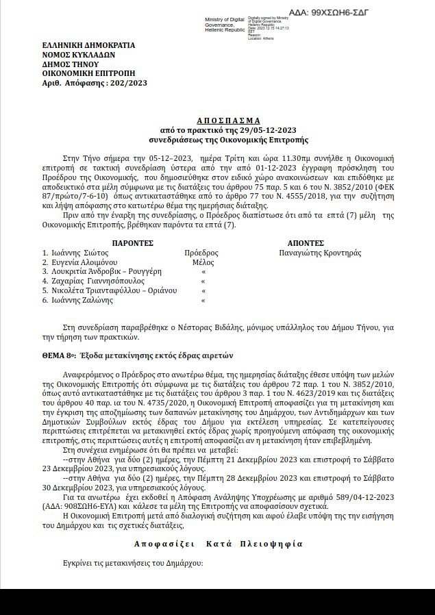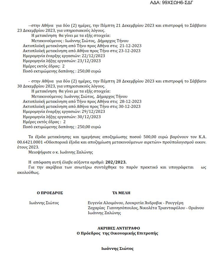 Με έκπληξη είδαμε στη ΔΙΑΥΓΕΙΑ την απόφαση της Οικονομικής Επιτροπής του Δήμου για εντολή μετακίνησής του στην Αθήνα για δύο (2) ημέρες, την Πέμπτη 21 Δεκεμβρίου 2023 και επιστροφή το Σάββατο 23 Δεκεμβρίου 2023, και για άλλες δύο (2) ημέρες, την Πέμπτη 28 Δεκεμβρίου 2023 και επιστροφή το Σάββατο 30 Δεκεμβρίου 2023, για υπηρεσιακούς λόγους, με συνολικό κόστος για το Δήμο 500,00€.