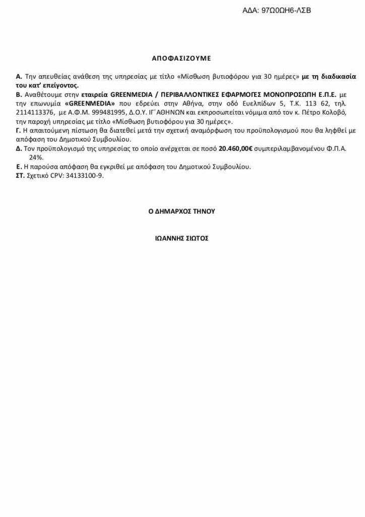 Η δε εταιρεία η οποία θα παρέχει την υπηρεσία αυτή είναι η ίδια που από το 2018 έχει αναλάβει πλήθος υπηρεσιών για τον Δήμο Τήνου (κάποιες με απευθείας ανάθεση) όπως, την λειτουργία του δεματοποιητή, την διαχείριση απορριμμάτων της “μεταβατικής περιόδου”, τον καθαρισμό παραλιών, τον τεμαχισμό ογκωδών απορριμμάτων, την αποκατάσταση του χώρου επεξεργασίας Α.Σ.Α., την μίσθωση νέου δεματοποιητή και την επισκευή μηχανήματος της υπηρεσίας ύδρευσης,