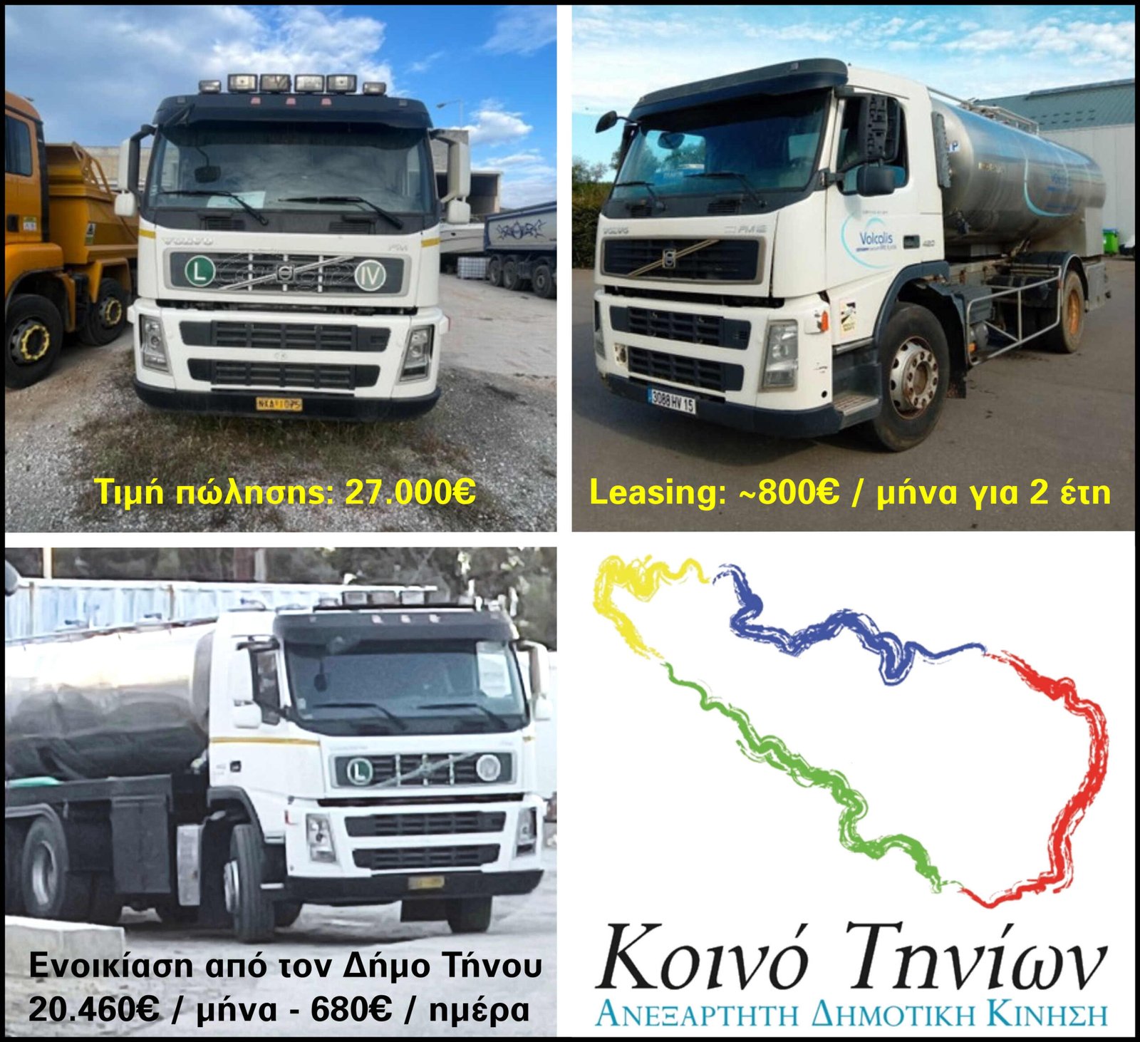 Με μια πρόσκληση για υποβολή προσφοράς που δημοσιεύτηκε στις 8/8/2023 και έληξε στις 9/8/2023 και ώρα 10.00 το πρωί, ο Δήμαρχος Τήνου, έλαβε προσφορά και ανέθεσε απευθείας την μίσθωση ενός βυτιοφόρου για τριάντα (30) ημέρες, με κόστος 20.460,00€, δηλαδή με 680€ την ημέρα! Ενδεικτικά, μπορεί πολύ εύκολα να βρει κανείς στο διαδίκτυο, ανάλογο μοντέλο βυτιοφόρου να ενοικιάζεται για 2 χρόνια, με λιγότερο από 1.000€ ανά μήνα (συνολικό κόστος ~18200€).
