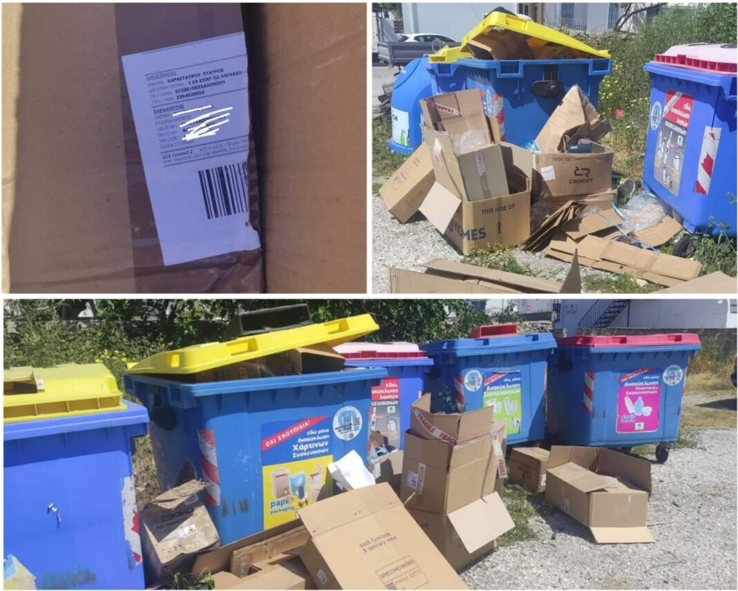 Οι κάδοι ανακύκλωσης υπάρχουν. Στη συγκεκριμένη περίπτωση ο ένας ήταν άδειος και ο άλλος είχε λίγα χαρτοκουτα που απορρίφθηκαν μέσα στον κάδο χωρίς να συμπιεστούν. Κάποιος επέλεξε τα πετάξει εκτός κάδων δημιουργώντας αυτή την εικόνα.