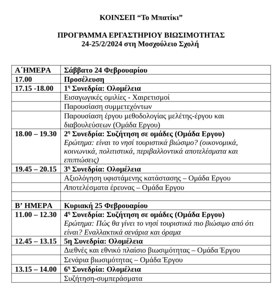 Το Εργαστήριο Βιωσιμότητας θα διενεργηθεί σε συνεργασία με το “Δίκτυο Βιώσιμων Κυκλάδων” μέλος του οποίου είναι “Το Μπατίκι” και θα πραγματοποιηθεί στη Μοσχούλειο Σχολή βάσει του προγράμματος που επισυνάπτεται. Η συμμετοχή Σ αυτό αποδεικνύει την πρόθεση μας να καθορίσουμε το μέλλον του τόπου μας, να συμμετέχουμε στην εξέλιξη μιας μελέτης που αποτελεί ορόσημο τόσο για το νησί μας αλλά και για όλα τα Κυκλαδονήσια.
