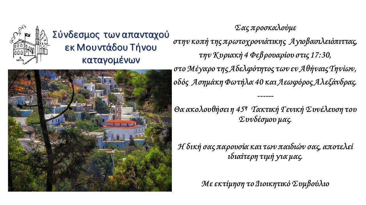 Το Διοικητικό Συμβούλιο του Συνδέσμου μας σας προσκαλεί την Κυριακή 4 Φεβρουαρίου 2024 και ώρα 17:30 στην αίθουσα του 2ου ορόφου, του μεγάρου της «Αδελφότητος των εν Αθήναις Τηνίων», οδός Ασημάκη Φωτήλα 40 και Λ. Αλεξάνδρας, όπου θα γίνει: